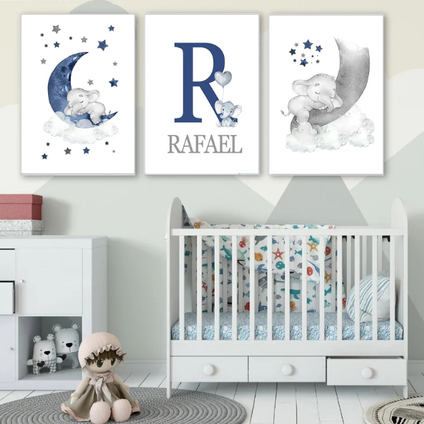 Affiche éléphants pastel personnalisée – Déco chambre garçon