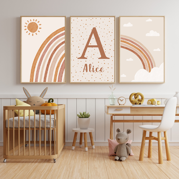 Affiche triptyque personnalisée pour chambre d’enfant avec un lion, une lettre et un arc-en-ciel beige et terracotta